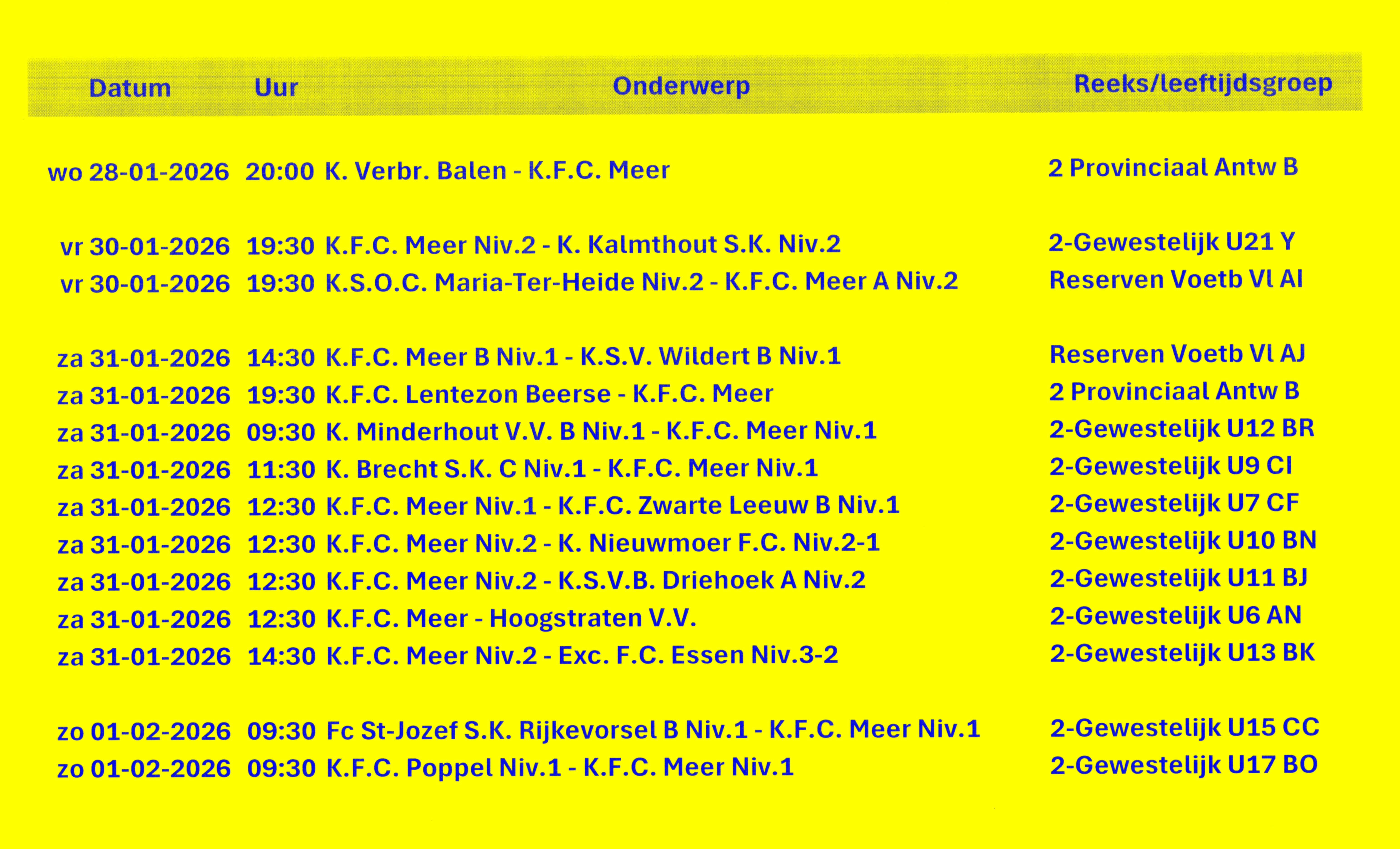 | Thuisclub | Andere club | Verslag | K. Vrijheid Herselt | 1 | 1 | K. Verbr. Balen 20u00 | K.F.C. Arendonk Sport | 1 | 1 | K. Eendracht F.C. Zoersel A. 14u30 ![]() Gespeeld op 25-01-2026 ▼ | K.F.C. Broechem | 3 | 0 | F.C. Wezel Sport B. 14u30 ![]() Gespeeld op 25-01-2026 ▼ | K.F.C. Ezaart Sport Mol | 0 | 1 | K.V.V. Vosselaar 14u30 ![]() Gespeeld op 25-01-2026 ▼ | K.F.C. Meer | 0 | 3 | K. Minderhout V.V. A. 19u30 | K.S.K. Weelde | 2 | 1 | K.F.C. Pulle 14u30 ![]() Gespeeld op 25-01-2026 ▼ | KVC Lille United B. | 1 | 1 | K.F.C. Lentezon Beerse 15u00 ![]() Gespeeld op 25-01-2026 ▼ | Loenhout S.K. | 0 | 3 | K. Noordstar V.V. 19u30 |