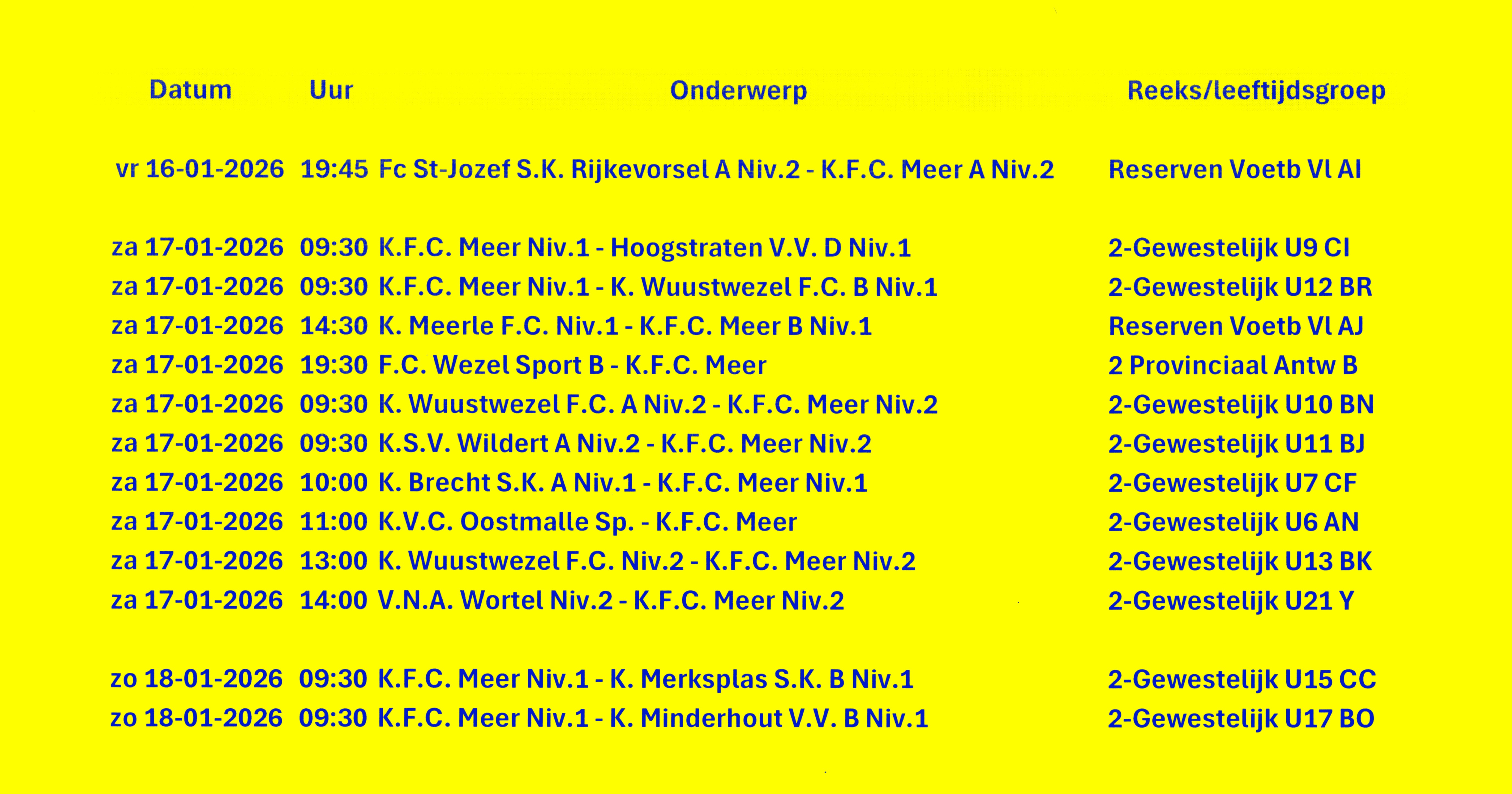 Gezien de aanhoudende slechte weersomstandigheden op onze terreinen van KFC Meer en omgeving, zullen naar alle waarschijnlijkheid de kansen op het spelen van voetbalwedstrijden in het weekend van 10 januari sterk afnemen.