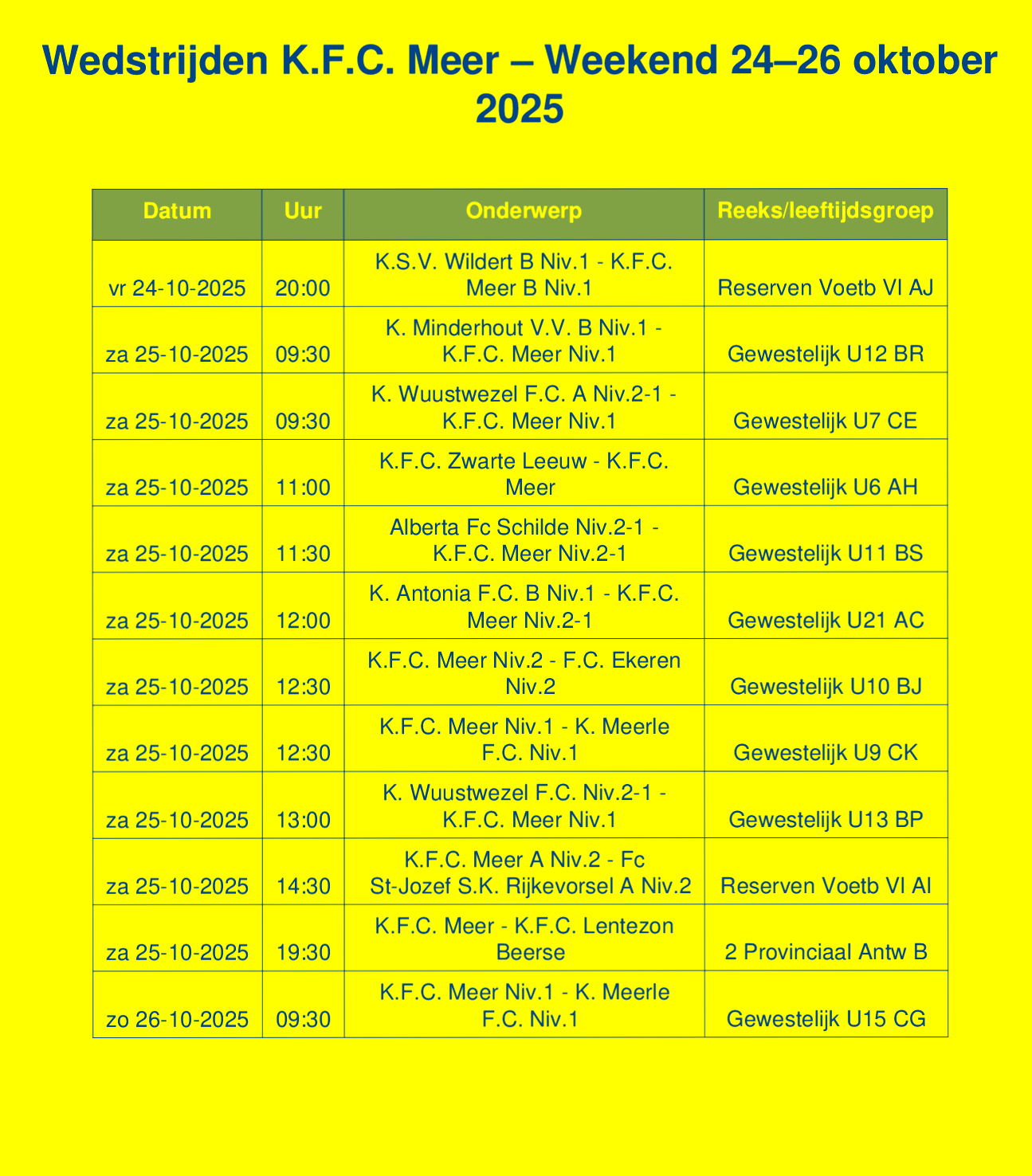 | Thuisclub | Andere club | Verslag | F.C. Wezel Sport B. | 2 | 3 | K.F.C. Lentezon Beerse 14u30 ![]() Gespeeld op 19-10-2025 ▼ | K. Eendracht F.C. Zoersel A. | 3 | 1 | K.F.C. Arendonk Sport 19u30 | K. Minderhout V.V. A. | 1 | 1 | K.F.C. Meer 19u30 | lezen | K. Noordstar V.V. | 2 | 3 | K. Verbr. Balen 15u00 ![]() Gespeeld op 19-10-2025 ▼ | K.F.C. Broechem | 3 | 0 | K.S.K. Weelde 15u00 ![]() Gespeeld op 19-10-2025 ▼ | K.F.C. Ezaart Sport Mol | 2 | 1 | K. Vrijheid Herselt 15u00 ![]() Gespeeld op 19-10-2025 ▼ | K.F.C. Pulle | 0 | 1 | Loenhout S.K. 15u00 ![]() Gespeeld op 19-10-2025 ▼ | K.V.V. Vosselaar | 5 | 1 | KVC Lille United B. 15u00 ![]() Gespeeld op 19-10-2025 ▼ |