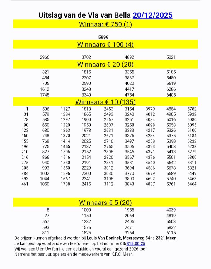 Het voetbalveld (B.) van K.F.C. Meer is zaterdag 20/12/25 onderverdeelt in +/- 6600 vakken van 1m² die, als het goed is, aan de man werden gebracht door onze leden en sympathisanten. Van deze stukken grond bent U dan eigenaar voor één dag. Op een bepaalt moment laten we ons Bella los op de wei en als ze haar behoefte doet op Uw stuk grond ben jij de winnaar van de hoofdprijs van 750€.