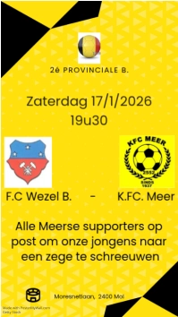 | Thuisclub | Andere club | Verslag | K. Eendracht F.C. Zoersel A. | 0 | 1 | K.V.V. Vosselaar 19u30 | K. Minderhout V.V. A. | 3 | 1 | K.S.K. Weelde 19u30 | K. Verbr. Balen | - | - | K.F.C. Meer 20u00 ![]() Gespeeld op 28-01-2026 ▼ | K. Vrijheid Herselt | 2 | 1 | K.F.C. Ezaart Sport Mol 20u00 | K.F.C. Arendonk Sport | 3 | 1 | K.F.C. Broechem 14u30 ![]() Gespeeld op 14-12-2025 ▼ | K.F.C. Lentezon Beerse | 2 | 1 | F.C. Wezel Sport B. 19u30 | K.F.C. Pulle | 1 | 2 | K. Noordstar V.V. 14u30 ![]() Gespeeld op 14-12-2025 ▼ | Loenhout S.K. | 1 | 0 | KVC Lille United B. 19u30 |