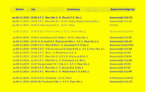 | Thuisclub | Andere club | Verslag | F.C. Wezel Sport B. | 3 | 2 | K.F.C. Ezaart Sport Mol 20u00 ![]() Gespeeld op 21-11-2025 ▼ | K. Eendracht F.C. Zoersel A. | 3 | 0 | K.F.C. Pulle 19u30 | K.F.C. Arendonk Sport | 1 | 3 | K. Minderhout V.V. A. 14u30 ![]() Gespeeld op 23-11-2025 ▼ | K.F.C. Broechem | 2 | 0 | K. Noordstar V.V. 14u30 ![]() Gespeeld op 23-11-2025 ▼ | K.F.C. Lentezon Beerse | 0 | 2 | K.V.V. Vosselaar 19u30 | K.F.C. Meer | 0 | 1 | KVC Lille United B. 19u30 | lezen | K.S.K. Weelde | 2 | 1 | K. Verbr. Balen 14u30 ![]() Gespeeld op 23-11-2025 ▼ | Loenhout S.K. | 1 | 1 | K. Vrijheid Herselt 19u30 |