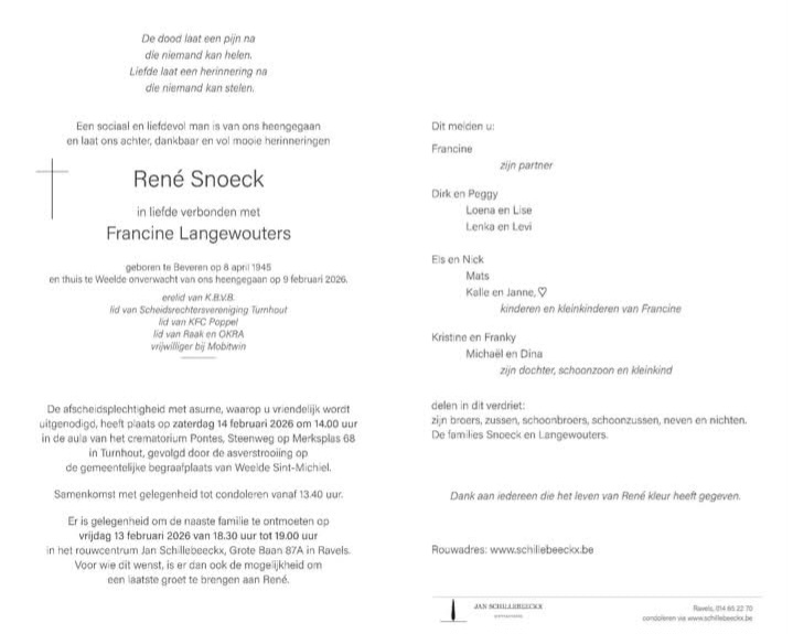 René Snoeck overleed één dag later, nl. op maandag 9 februari. René, een vroegere topref, was ondank zijn 80 jaar nog elke week op het groene veld te vinden en was de vriend van elke jeugdspeler en begeleider. Hij zal eveneens sterk gemist worden en K.F.C. Meer wenst zijn familie veel sterkte toe bij het verlies van hun geliefde.