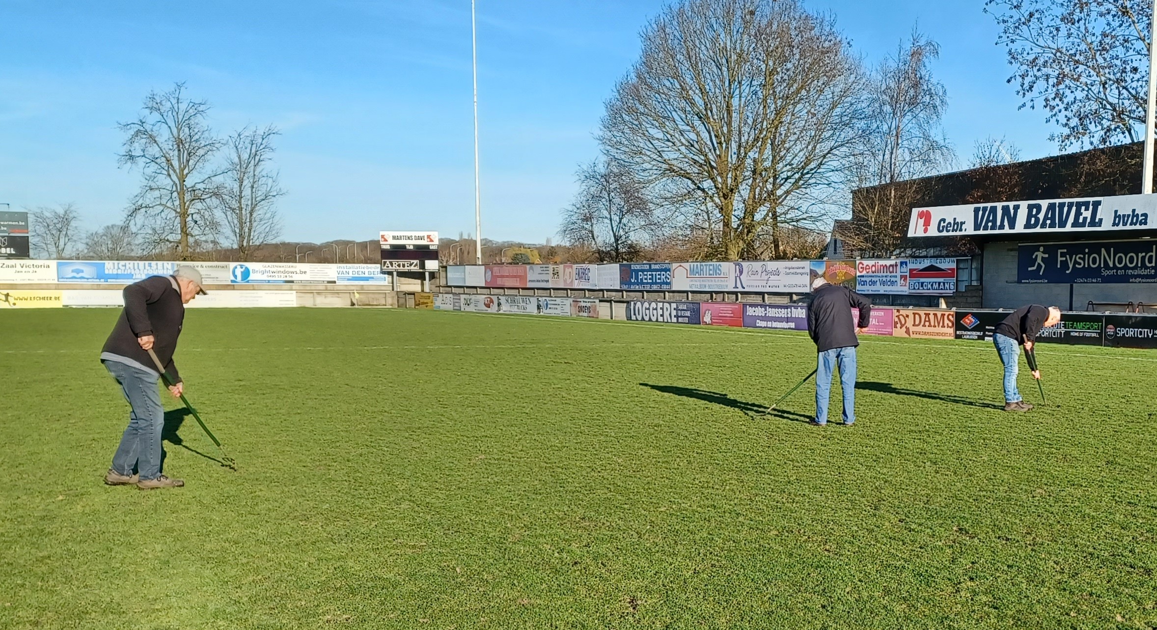 Hieronder zie je de mannen van de maandagploeg aan het werk om de pleinen weer bespeelbaar te maken voor de volgende wedstrijden. Respect voor onze terreinverzorgers Cel, Cor, Fons, Fons en Jos.