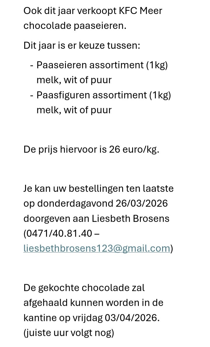 De gekochte chocolade zal afgehaald kunnen worden in de kantine op vrijdag 03/04/2026. (juiste uur volgt nog)